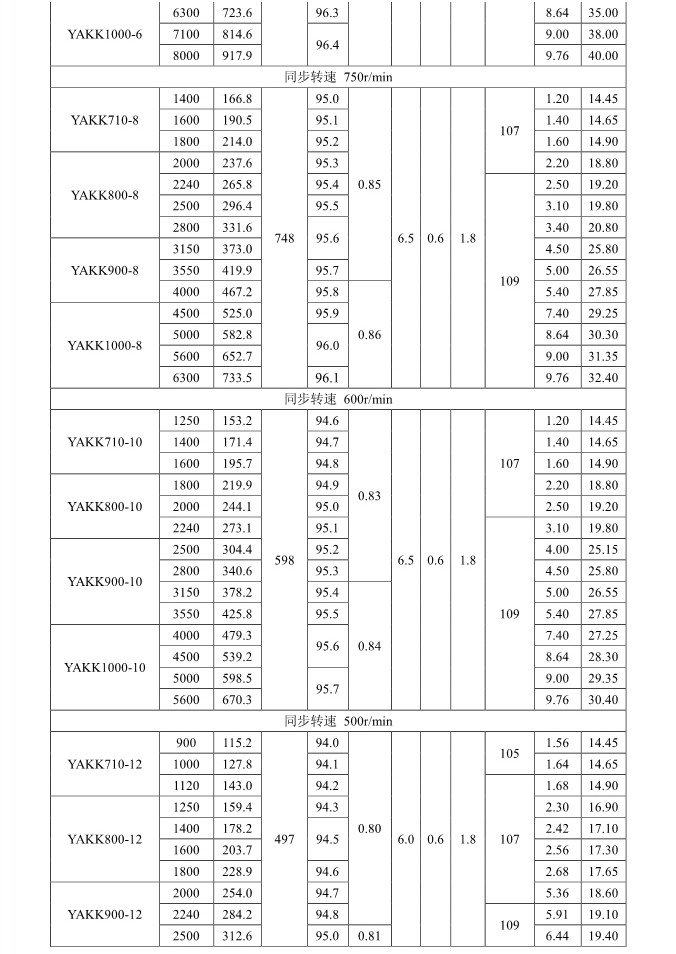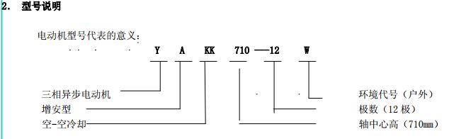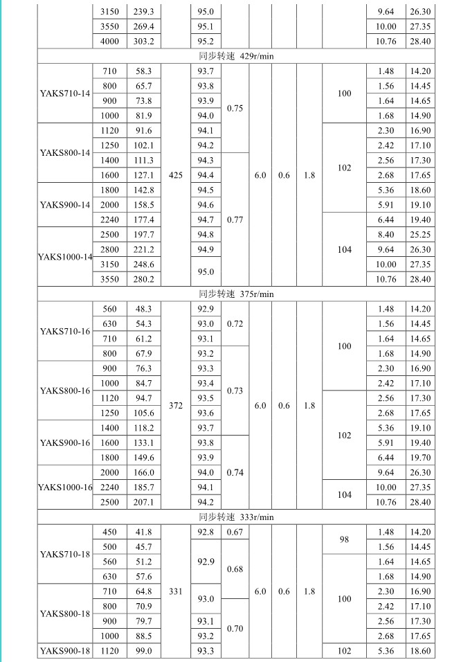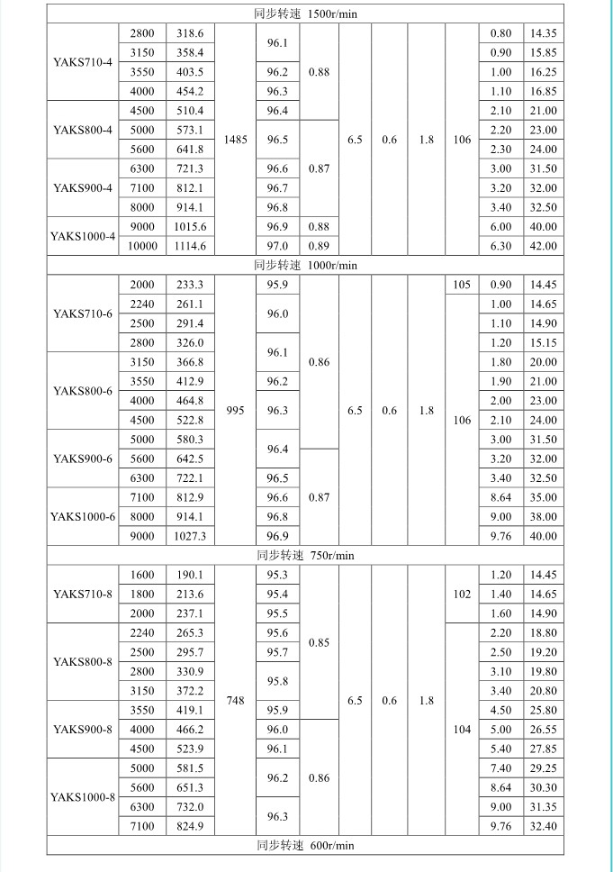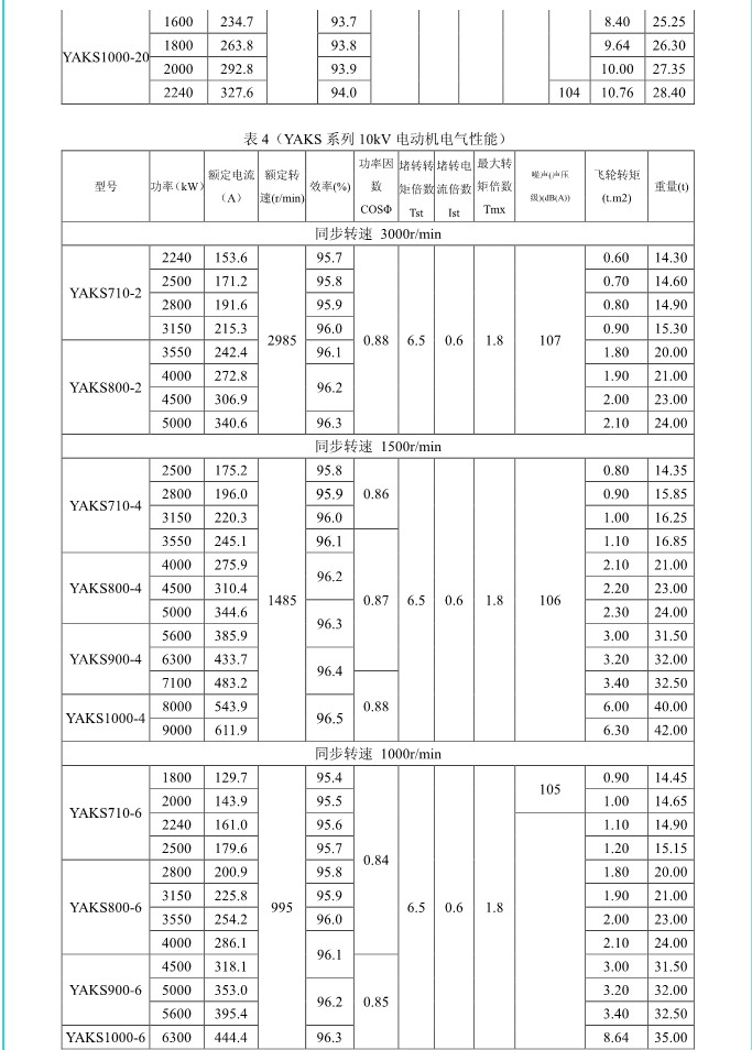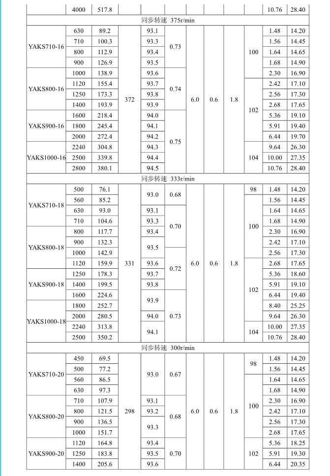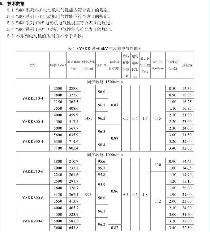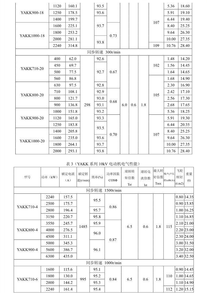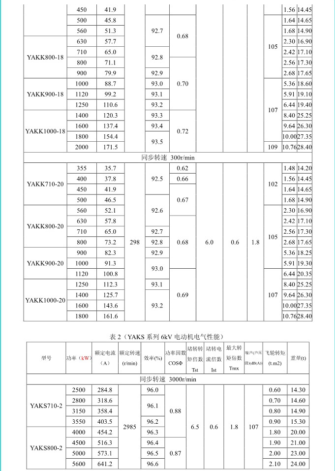 1. 概述 YAKK、YAKS 系列高壓增安型三相異步電動機(機座號710~1000)是我公司在引進吸收德國西門子高壓電動機制造技術的基礎上,結合我公司長期穩定生產高壓三相異步電動機的設計制造經驗而開發的系列產品。該系列電動機采用九十年代新技術、新材料、新工藝,選材考究、制造精良、具有體積小、重量輕、功率大、效率高、噪聲低、振動小、運行安全可靠、使用維護方便等特點。 該系列電動機符合我國國家標準GB755《旋轉電機 定額和性能》、行業標準GB/T13957《大型三相異步電動機基本系列技術條件》和IEC 國際標準,其防爆性能符合GB3836.1《爆炸性氣體環境用電氣設備第1部分:通用要求》和GB3836.3《爆炸性氣體環境用電氣設備第3 部分:增安型“e”》的規定。 各部分機械尺寸和公差符合相應的國家標準和國際標準 該系列電動機的外殼防護等級為IP44、IP54 和 IP55,冷卻方式有IC611 和 IC81W,安裝方式為IMB3,也可根據用戶要求制成不同的防護類型、冷卻方式、安裝方式。 額定電壓:6000V、10000V 功率范圍:315~10000kW 同步轉速:3000、1500、1000、750、600、500、429、375、333、300r/min 軸中心高:710、800、900、1000mm 防爆標志:ExeIIT1、ExeIIT2、ExeIIT3 在此基礎上派生有戶外(W)、濕熱帶(TH)、戶外濕熱帶(THW)、戶內防中等腐蝕型(F1)、戶內防強腐蝕型(F2)、戶外防中等腐蝕型(WF1)、戶外防強腐蝕型(WF2),派生的三相異步電動機的性能指標、安裝外形尺寸與基本系列的相同。  3. 結構說明 該系列電動機采用國際流行的箱式結構,機座、端蓋等部件用鋼板焊成,軸承采用端蓋式球面滑動軸承,具有負荷能力強,檢修及裝配方便等優點。電動機重量輕、剛度好。卸下冷卻器,可觀察或接觸電動機內部,安裝和維修方便。 定子采用F 級絕緣,定子線圈采用雙玻璃絲包薄膜帶繞包銅扁線繞制,經繞包主絕緣并VPI 整體浸漆后具有較高的電氣強度、機械強度、絕緣性能、防潮性和熱穩定性。 轉子采用銅條結構,導條和端環之間采用可靠的焊接工藝,并采取了防止導條斷裂的可靠措施,經高精度校驗平衡,電動機運轉平穩,振動小。 高壓接線盒為密封結構,接線空腔大,留有電纜接頭位置。接線盒在電動機右側(軸伸端視之)。當電動機功率為2000kW 及以上時,在電動機主接線盒的另一側設置副接線盒,用于電動機定子三相繞組的中性點連接以及電動機的差動保護。根據用戶的需要,電動機可安裝軸承測溫儀表,監測軸承溫度;也可根據用戶需要設置定子繞組測溫和防冷凝加熱裝置。 4. 使用條件 額定電壓: 6kV 或 10kV 額定頻率: 50Hz 環境空氣溫度: -5℃~+40℃ 海拔高度: 不超過 1000mm 工作制: 連續工作制 S1 環境條件: 戶內、戶外(W)、濕熱帶(TH)、戶外濕熱帶(THW)、戶內防中等腐蝕型(F1)、戶內防強腐蝕型(F2)、戶外防中等腐蝕型(WF1)、戶外防強腐蝕型(WF2) 運行地點最濕月月平均最高相對濕為90%,同時該月月平均最低溫度不高于25℃該系列電動機可用于驅動各種通用機械:如壓縮機、水泵、風機以及其它機械設備,在礦山、機械工業、石油化工工業、發電廠等工礦企業具有爆炸性氣體環境的場所中作為原動機使用。