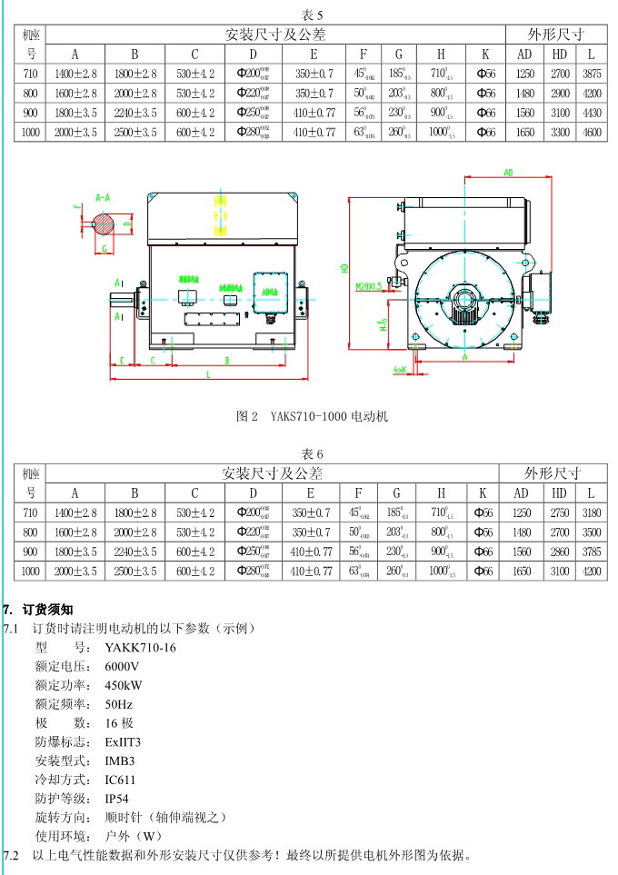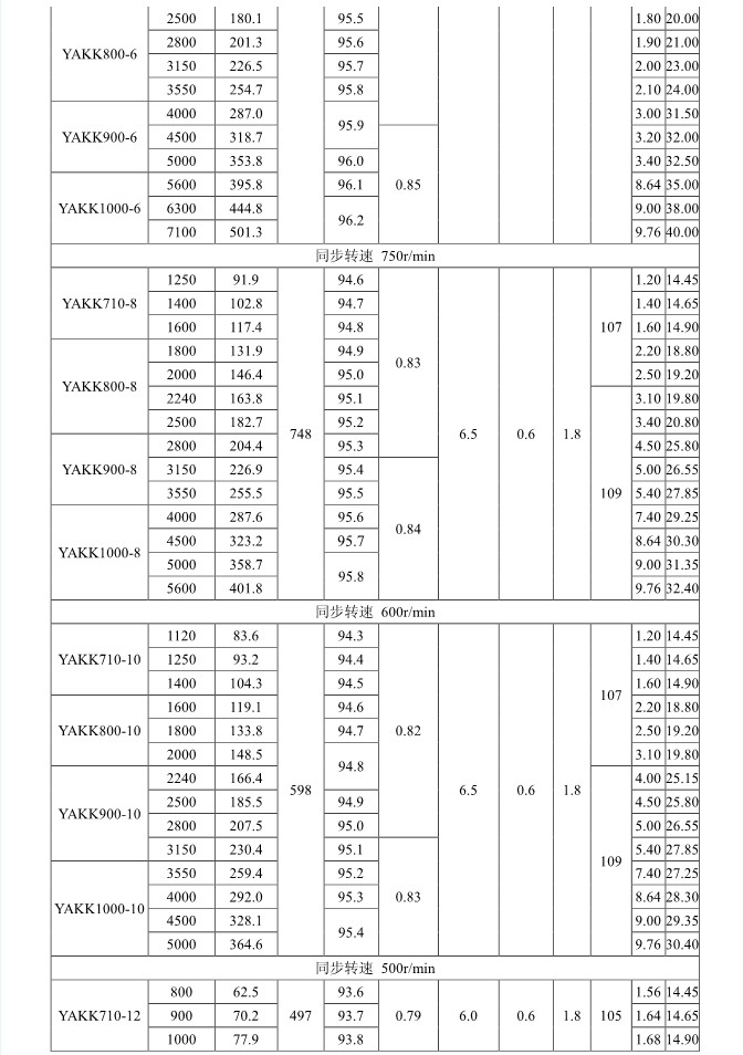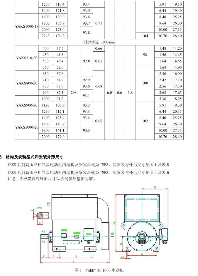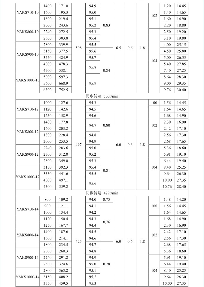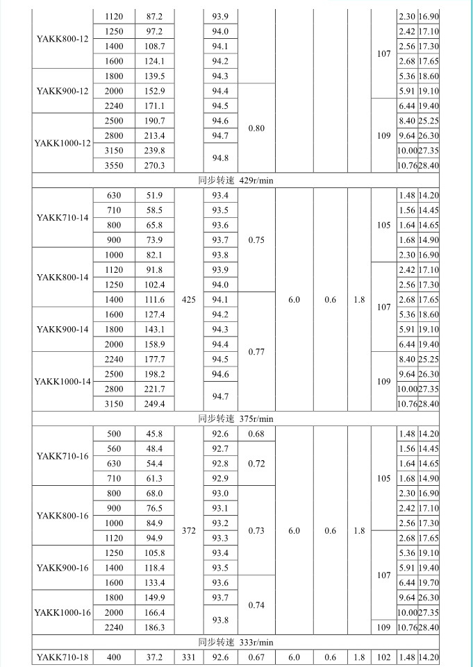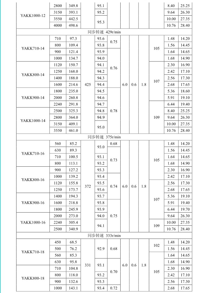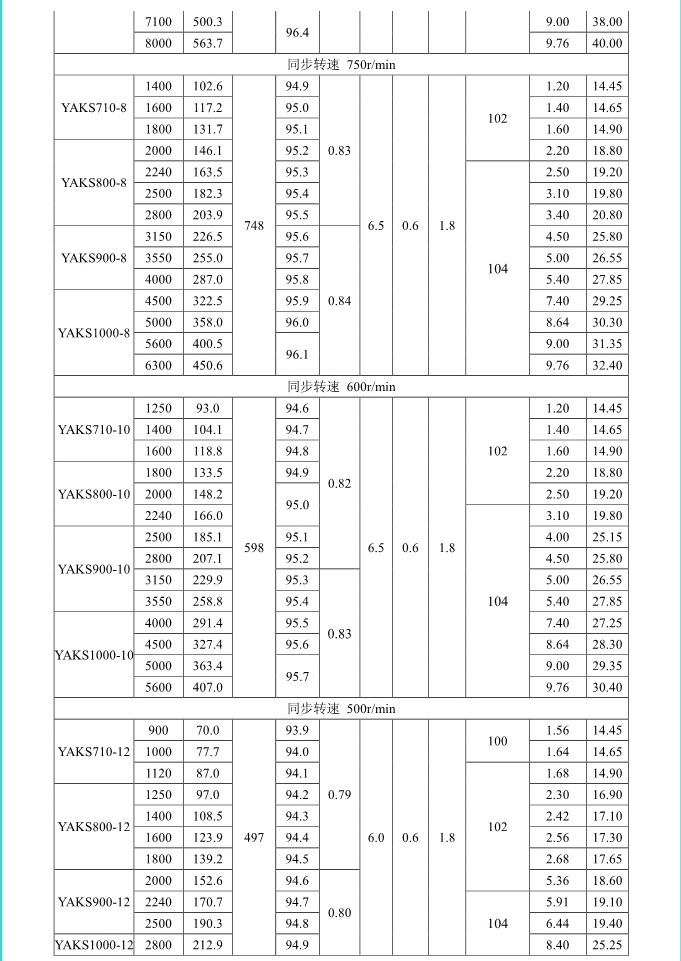 1. 概述 YAKK、YAKS 系列高壓增安型三相異步電動機(機座號710~1000)是我公司在引進吸收德國西門子高壓電動機制造技術的基礎上,結合我公司長期穩定生產高壓三相異步電動機的設計制造經驗而開發的系列產品。該系列電動機采用九十年代新技術、新材料、新工藝,選材考究、制造精良、具有體積小、重量輕、功率大、效率高、噪聲低、振動小、運行安全可靠、使用維護方便等特點。 該系列電動機符合我國國家標準GB755《旋轉電機 定額和性能》、行業標準GB/T13957《大型三相異步電動機基本系列技術條件》和IEC 國際標準,其防爆性能符合GB3836.1《爆炸性氣體環境用電氣設備第1部分:通用要求》和GB3836.3《爆炸性氣體環境用電氣設備第3 部分:增安型“e”》的規定。 各部分機械尺寸和公差符合相應的國家標準和國際標準 該系列電動機的外殼防護等級為IP44、IP54 和 IP55,冷卻方式有IC611 和 IC81W,安裝方式為IMB3,也可根據用戶要求制成不同的防護類型、冷卻方式、安裝方式。 額定電壓:6000V、10000V 功率范圍:315~10000kW 同步轉速:3000、1500、1000、750、600、500、429、375、333、300r/min 軸中心高:710、800、900、1000mm 防爆標志:ExeIIT1、ExeIIT2、ExeIIT3 在此基礎上派生有戶外(W)、濕熱帶(TH)、戶外濕熱帶(THW)、戶內防中等腐蝕型(F1)、戶內防強腐蝕型(F2)、戶外防中等腐蝕型(WF1)、戶外防強腐蝕型(WF2),派生的三相異步電動機的性能指標、安裝外形尺寸與基本系列的相同。  3. 結構說明 該系列電動機采用國際流行的箱式結構,機座、端蓋等部件用鋼板焊成,軸承采用端蓋式球面滑動軸承,具有負荷能力強,檢修及裝配方便等優點。電動機重量輕、剛度好。卸下冷卻器,可觀察或接觸電動機內部,安裝和維修方便。 定子采用F 級絕緣,定子線圈采用雙玻璃絲包薄膜帶繞包銅扁線繞制,經繞包主絕緣并VPI 整體浸漆后具有較高的電氣強度、機械強度、絕緣性能、防潮性和熱穩定性。 轉子采用銅條結構,導條和端環之間采用可靠的焊接工藝,并采取了防止導條斷裂的可靠措施,經高精度校驗平衡,電動機運轉平穩,振動小。 高壓接線盒為密封結構,接線空腔大,留有電纜接頭位置。接線盒在電動機右側(軸伸端視之)。當電動機功率為2000kW 及以上時,在電動機主接線盒的另一側設置副接線盒,用于電動機定子三相繞組的中性點連接以及電動機的差動保護。根據用戶的需要,電動機可安裝軸承測溫儀表,監測軸承溫度;也可根據用戶需要設置定子繞組測溫和防冷凝加熱裝置。 4. 使用條件 額定電壓: 6kV 或 10kV 額定頻率: 50Hz 環境空氣溫度: -5℃~+40℃ 海拔高度: 不超過 1000mm 工作制: 連續工作制 S1 環境條件: 戶內、戶外(W)、濕熱帶(TH)、戶外濕熱帶(THW)、戶內防中等腐蝕型(F1)、戶內防強腐蝕型(F2)、戶外防中等腐蝕型(WF1)、戶外防強腐蝕型(WF2) 運行地點最濕月月平均最高相對濕為90%,同時該月月平均最低溫度不高于25℃該系列電動機可用于驅動各種通用機械:如壓縮機、水泵、風機以及其它機械設備,在礦山、機械工業、石油化工工業、發電廠等工礦企業具有爆炸性氣體環境的場所中作為原動機使用。