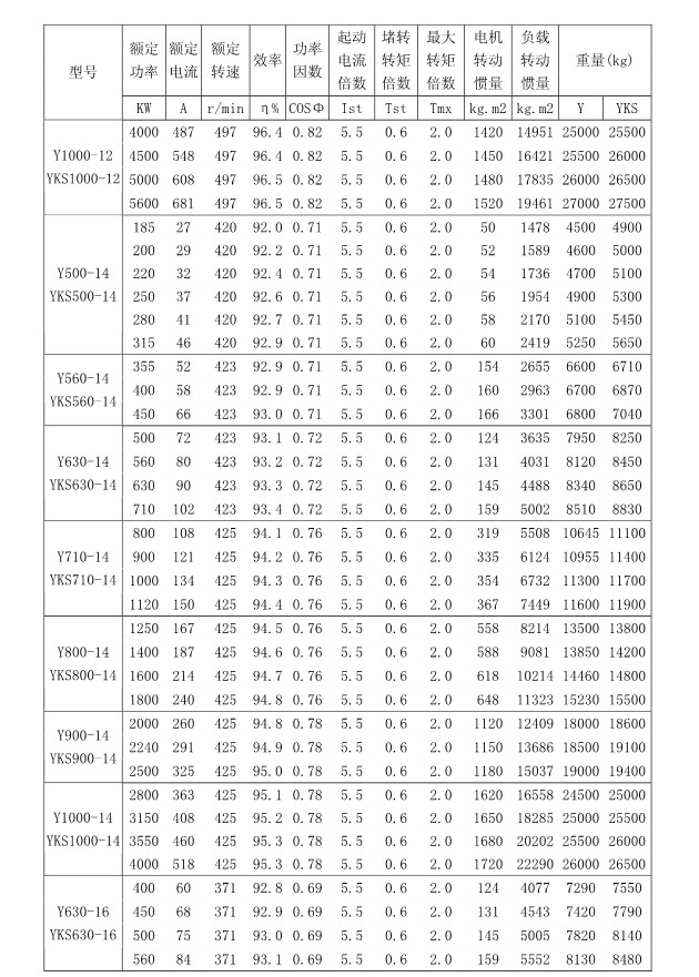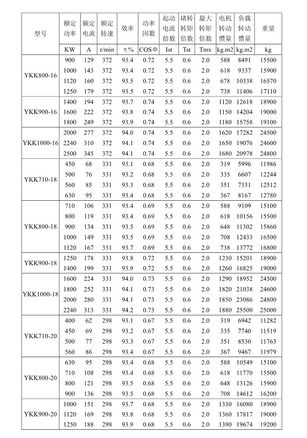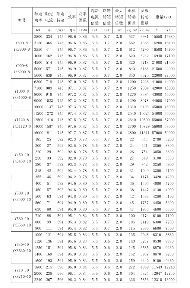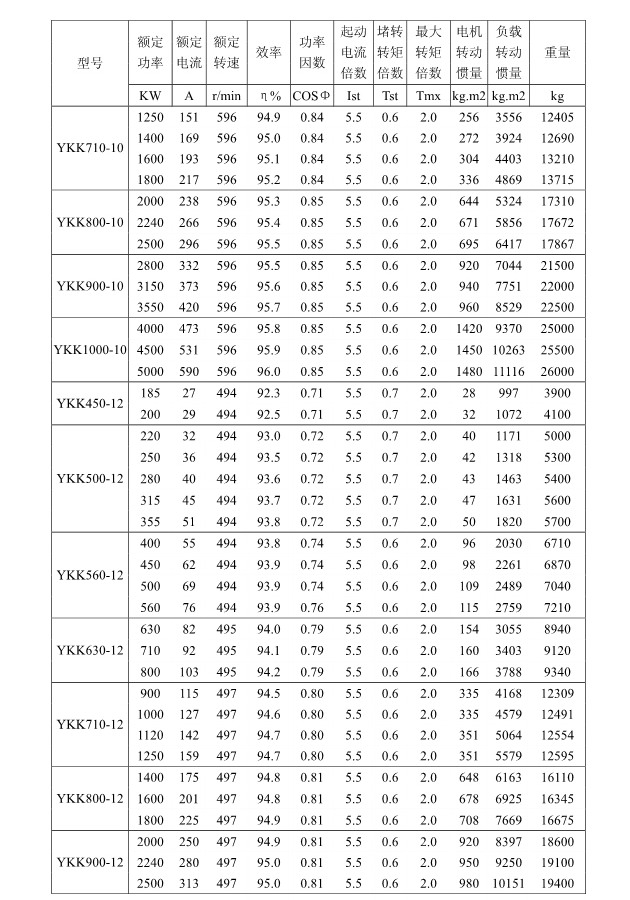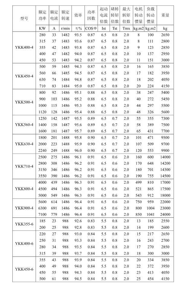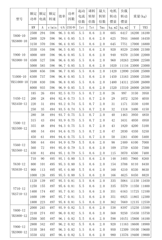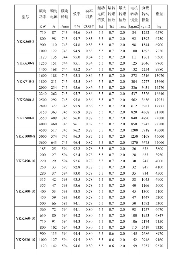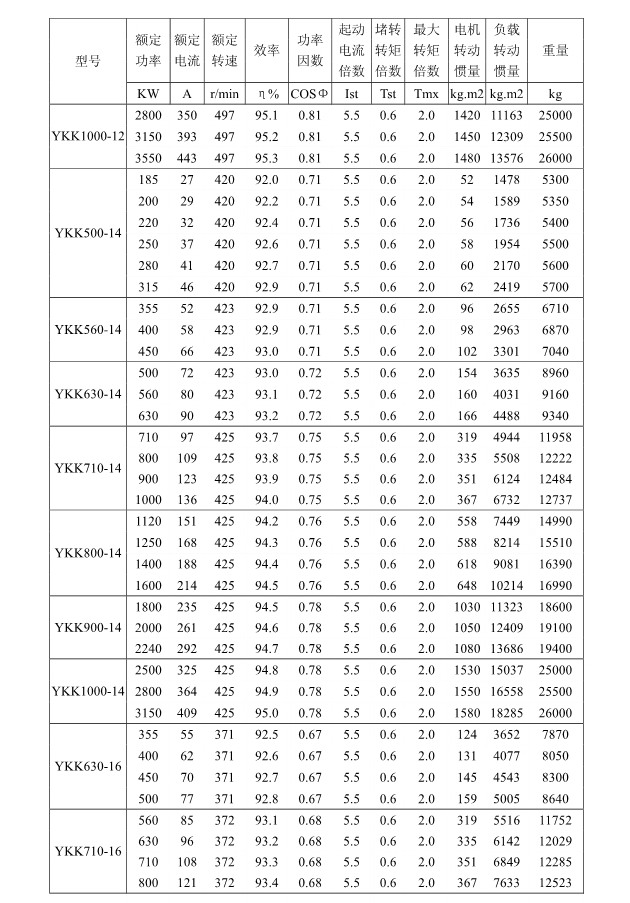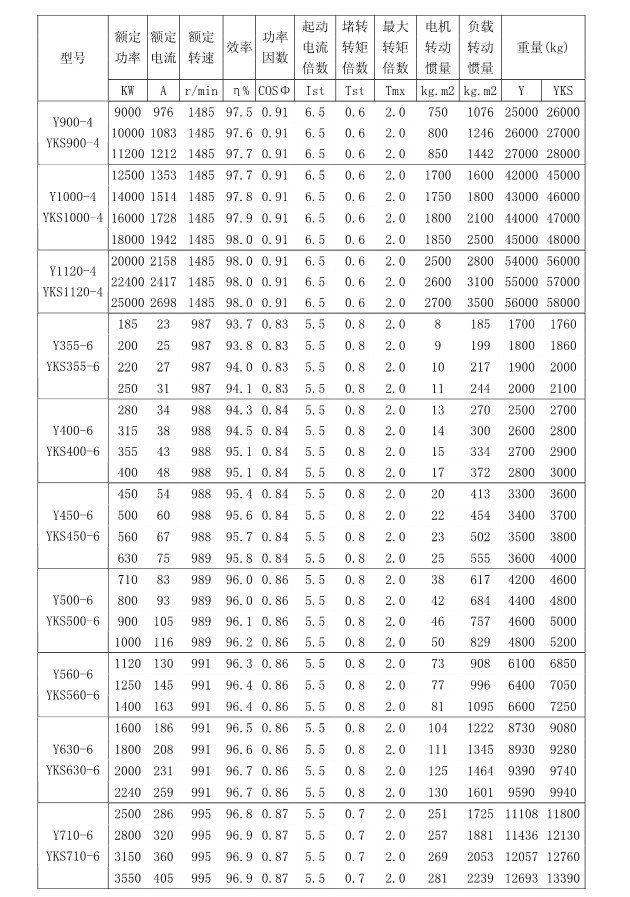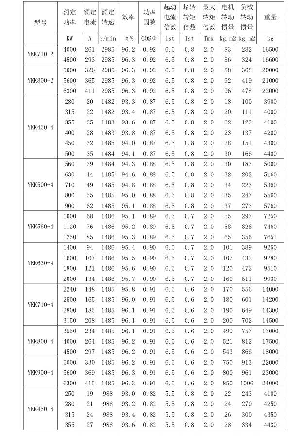 1 概述 YKK、Y、YKS 系列高壓三相異步電動機(機座號355~1120)是我公司在引進吸收消化國外先進技術的基礎上,結合我公司長期穩定生產高壓三相異步電動機的設計制造經驗而開發的新一代產品。 本系列電動機選材考究、制造精良、具有體積小、重量輕、功率大、效率高、噪聲低、振動小、運行安全可靠、使用維護方便、節能環保等特點。 本系列電動機符合以下標準和規范 GB755 《旋轉電機定額和性能》 GB/T13957 《大型三相異步電動機基本系列技術條件》 JB/T7593 《Y 系列高壓三相異步電動機技術條件(機座號355-630)》 JB/T10315.1 《YKS、YKS-W、YQF 系列高壓三相異步電動機技術條件(機座號 355-630)》 JB/T10315.2 《YKK、YKK-W 系列高壓三相異步電動機技術條件(機座號355-630)》 GB10069.3 《旋轉電機噪聲測定方法及限值第 3 部分:噪聲限值》 GB10068 《中心高為56mm及以上電機的機械振動振動的測量及限值》 2 型號說明