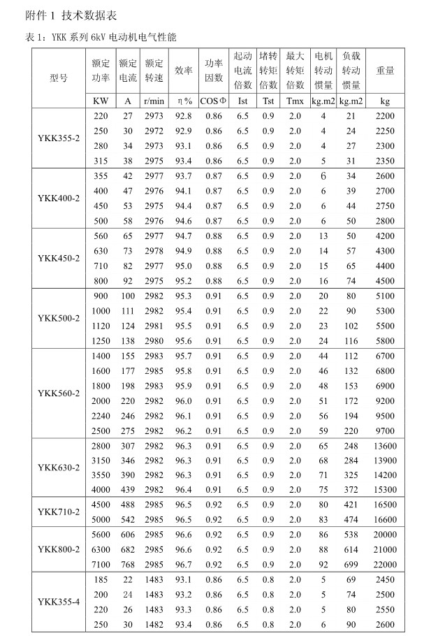 7、使用條件 額定電壓: 6kV或 10kV±5% 額定頻率: 50Hz±3% 環境空氣溫度: -5℃~+40℃ 海拔高度: 不超過 1000mm 工作制: 連續工作制 S1 環境條件: 戶外(W)、戶外防中腐蝕(WF1)、戶外防強腐蝕(WF2)、化工防輕腐蝕(F)、化工防中腐蝕(F1)、化工防強腐蝕(F2)、濕熱帶(TH)、干熱帶(TA)、戶外濕熱帶(WTH)、戶外干熱帶(WTA) 注意:對環境空氣溫度、海拔、電源電壓及頻率如有特殊要求,請在訂貨時提出。 8 質量保證 公司視產品質量為企業的生命。先后取得ISO9001、ISO10012、OHS18000、ISO14001 管理體系認證。 擁有國際先進的軟件,實現了虛擬樣機設計開發。將設計-工程分析-模擬裝配-失效模式分析等各個環節組成一個完整的產品開發體系。對產品進行最終檢驗和性能測試。 按照公司質量保證聲明,做好產品銷售每個環節的服務。 9 訂貨指南 訂貨時請注明電動機的型號、額定電壓、額定功率、頻率、極數、安裝型式、冷卻方式、防護等級、旋轉方向、使用環境、海拔高度等。 如有特殊要求,雙方簽訂協議后,還可提供各種特殊規格電機(如不同電壓、不同頻率、雙軸伸、接線盒位置、噪聲要求、不同環境條件、干濕熱帶型等)。 用以傳動鼓風機、磨煤機、軋鋼機、卷揚機、皮帶機的電動機在訂貨時提供有關技術資料,并要簽訂技術協議,作為電機特殊設計的依據,以確保電機的可靠運行。 本系列電動機也可制成變頻電機,變頻范圍0~60Hz,功率等級、外形尺寸等另行通知。 隨著產品的技術進步和國內外相關標準的修訂,樣本技術參數如有變動,恕不另行通知,訂貨后請向我公司索取外形安裝尺寸及技術數據,最終以提供資料數據為準。 附件 1 技術數據表 附件 2 安裝尺寸表